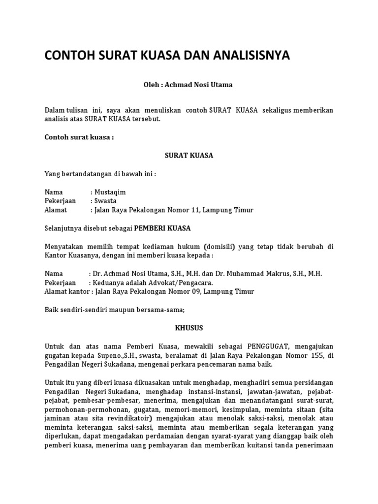Contoh Surat Kuasa Dan Analisisnya Pdf